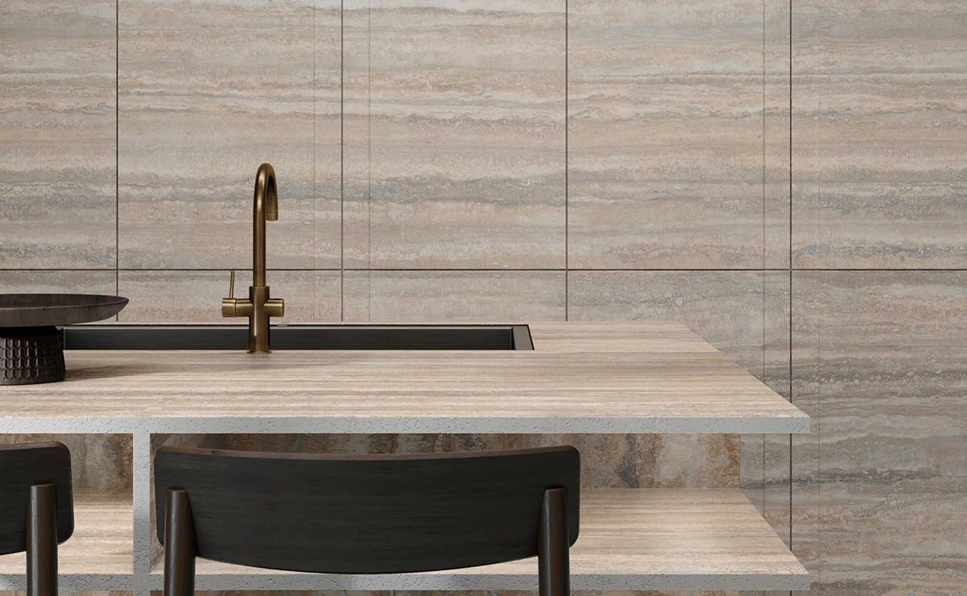 - Travertini moderni: proposte come Travertino Trilogy valorizzano la vena passante interna della lastra, grazie a un corpo materico studiato per integrare perfettamente superficie e sezione. È una soluzione perfetta per cucine in stile moderno in cui bordi, spessori e lavorazioni a vista diventano elementi di design.