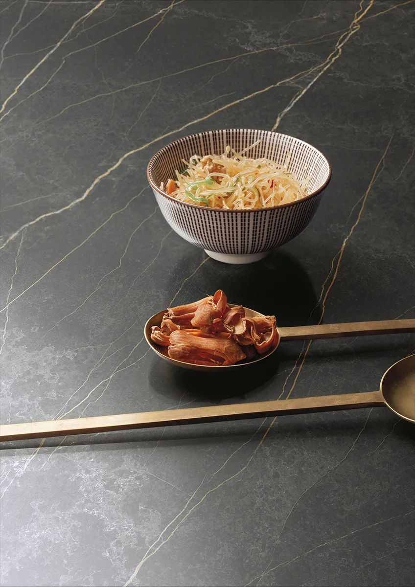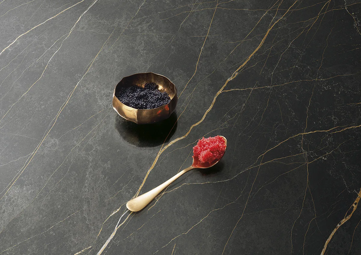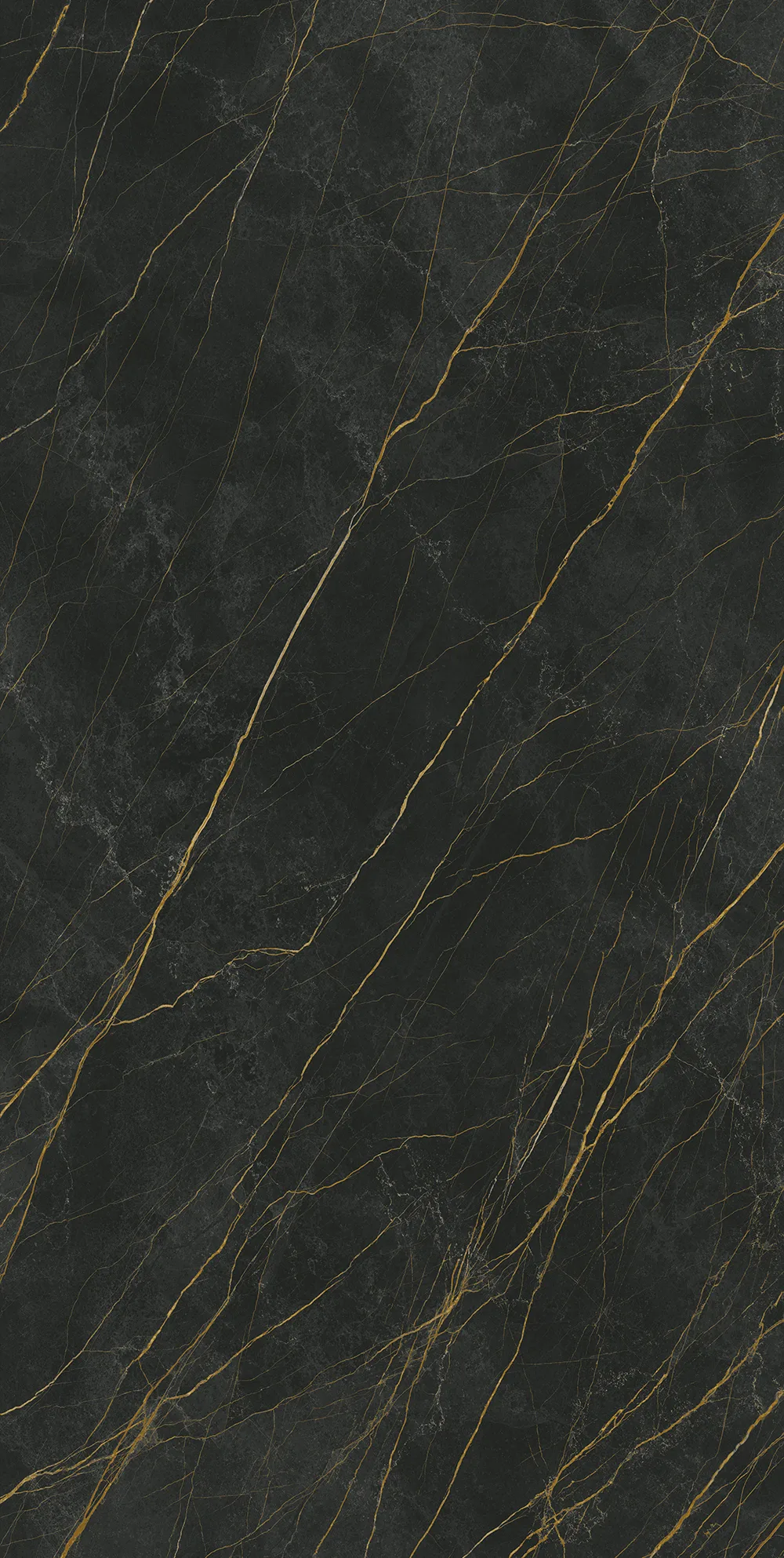 La raffinatezza del nero e il prestigio della venatura gold: una lastra in grado di evocare la ricchezza del marmo naturale in una superficie armonica.