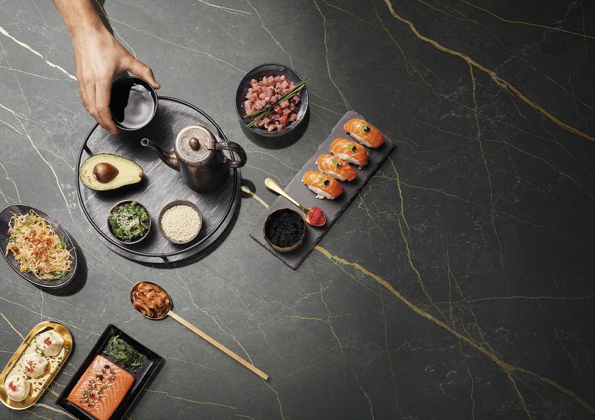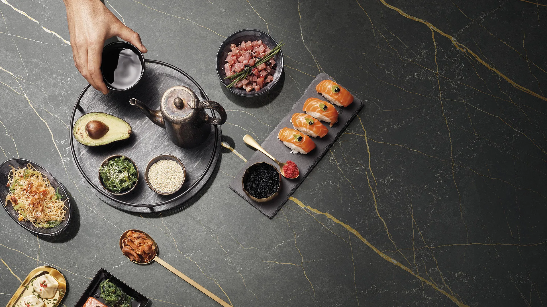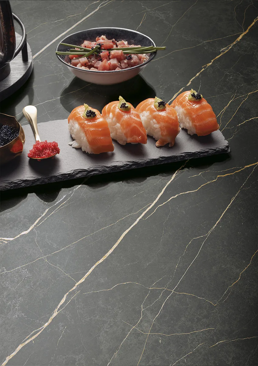 La raffinatezza del nero e il prestigio della venatura gold: una lastra in grado di evocare la ricchezza del marmo naturale in una superficie armonica.
