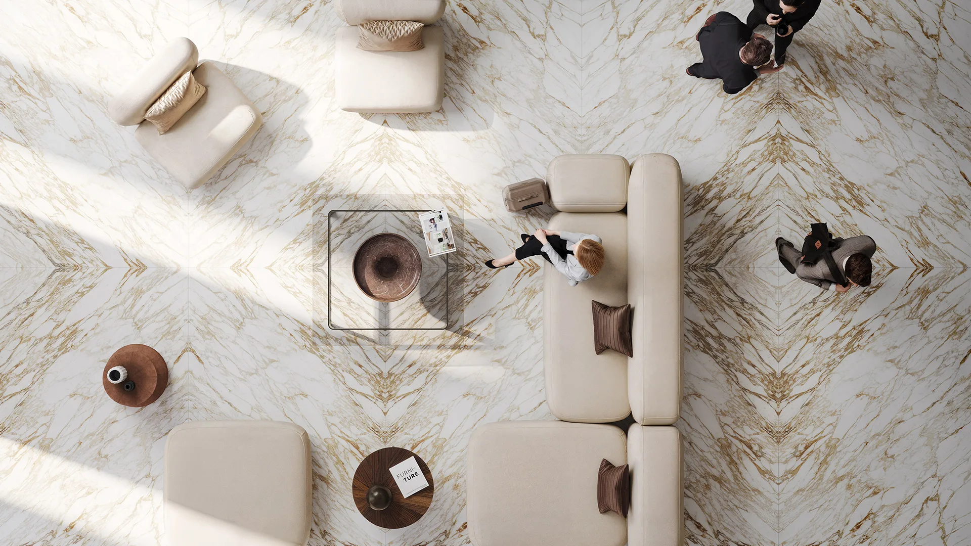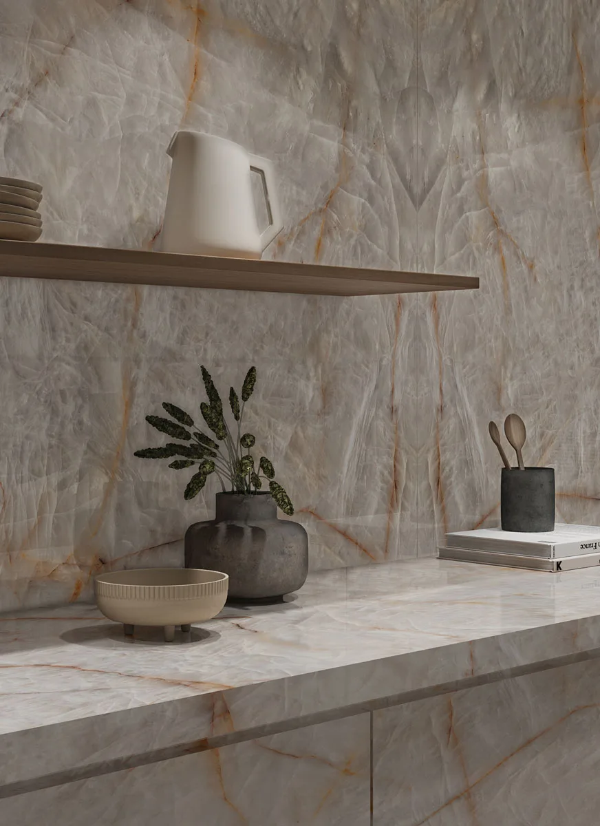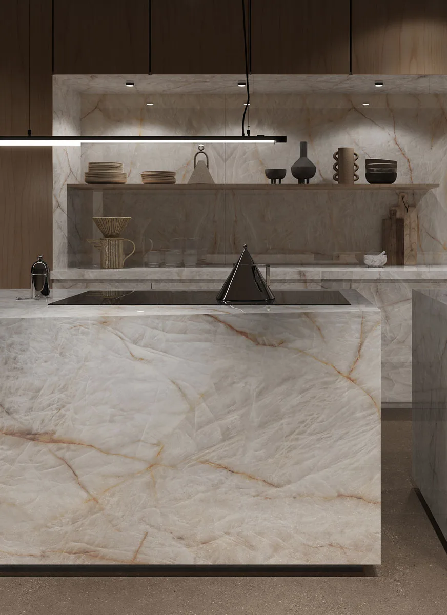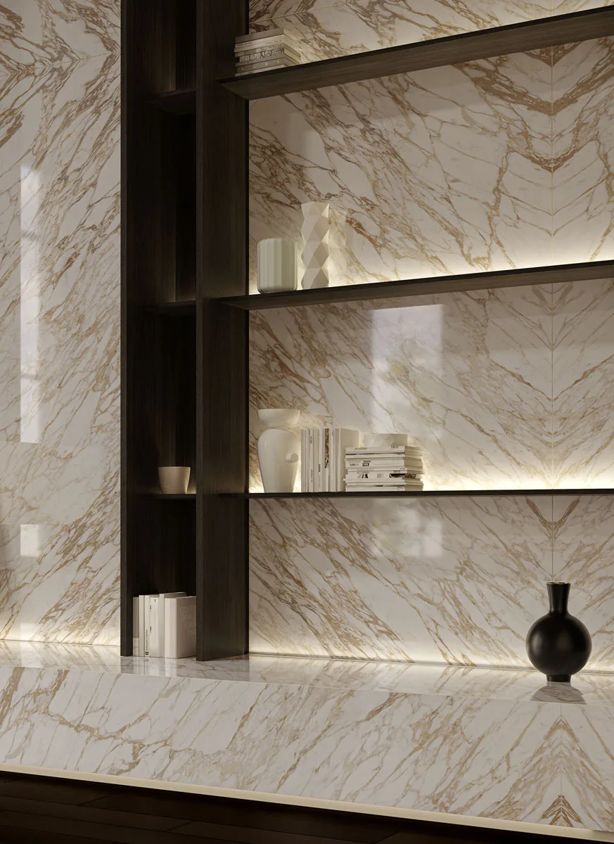 Arabescato Diva’s aesthetic pays tribute to one of the most iconic Italian marbles, celebrating the rarity of precious materials to create a striking visual impact. Its luminous surface, featuring a light background with golden veining, blends refined design with technical innovation.
