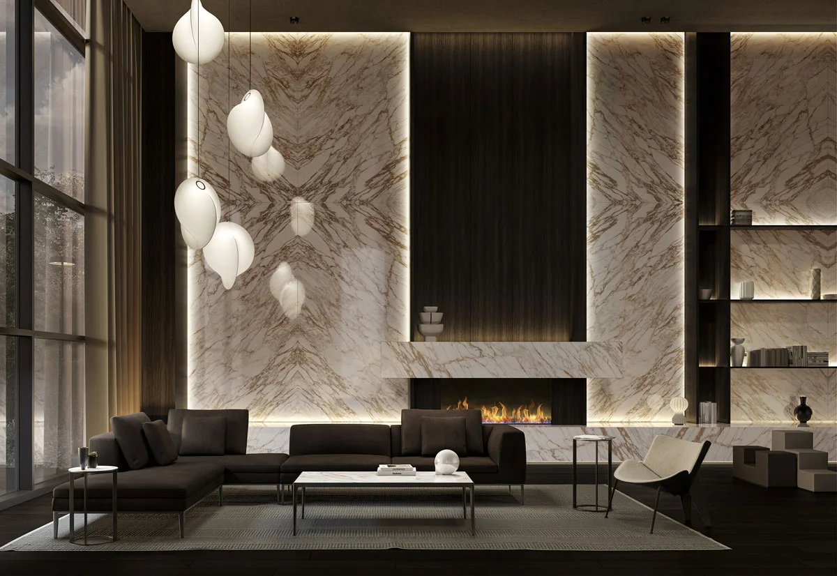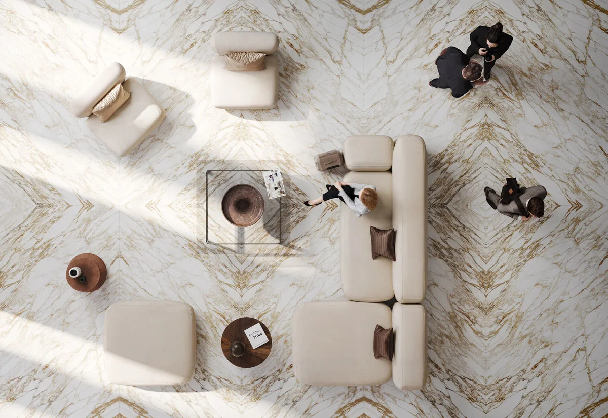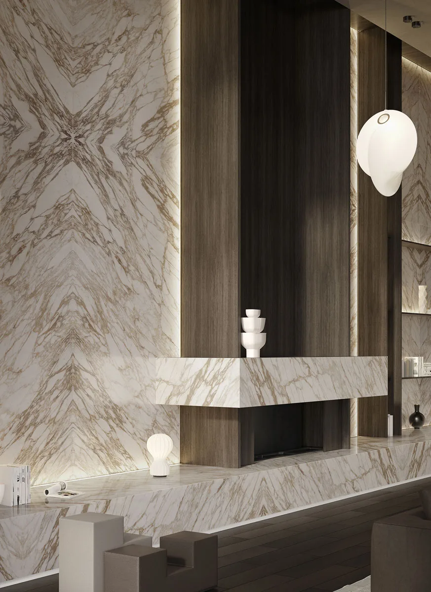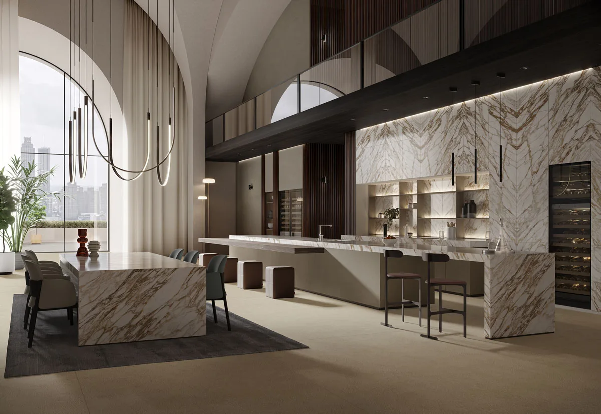 Arabescato Diva’s aesthetic pays tribute to one of the most iconic Italian marbles, celebrating the rarity of precious materials to create a striking visual impact. Its luminous surface, featuring a light background with golden veining, blends refined design with technical innovation.