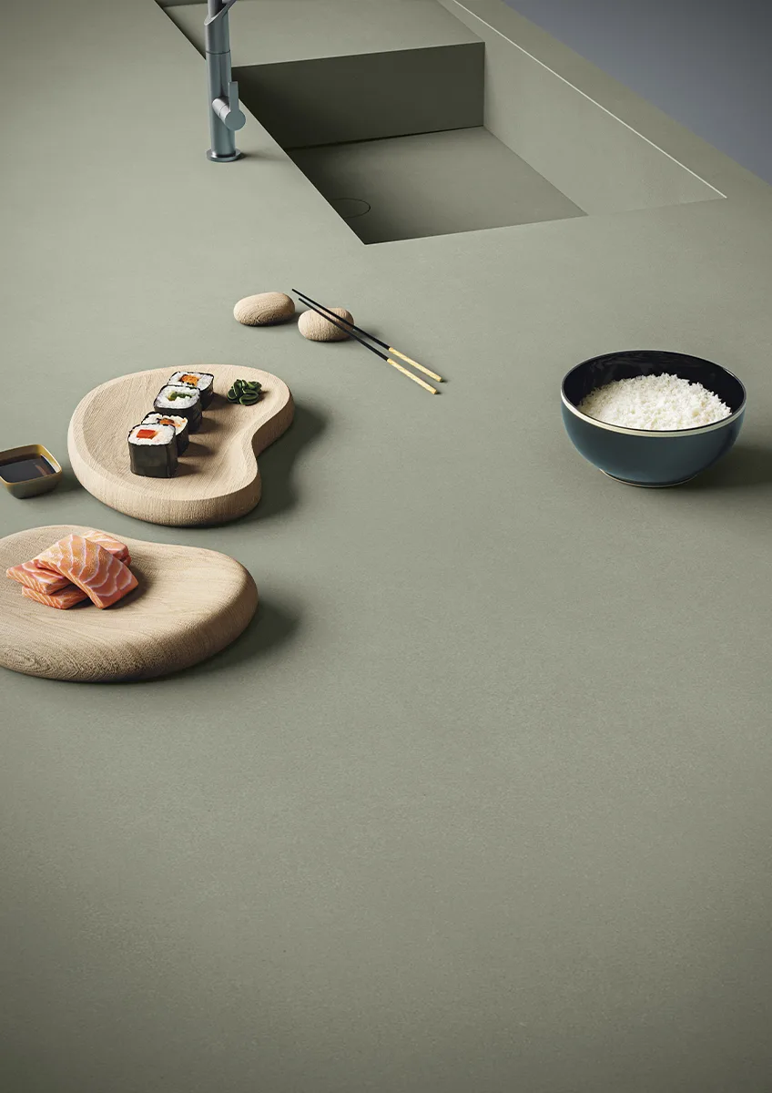 Une surface qui renferme toute l’élégance du design italien grâce à une teinte sauge alliant tradition et modernité. L’esthétique épurée de la résine unie en fait une solution idéale pour insuffler fraîcheur et grâce mesurée dans chaque contexte, qu’elle soit intégrée dans des environnements monochromes ou associée à des nuances et matériaux inattendus. La finition mate confère une sensation de sobriété raffinée.