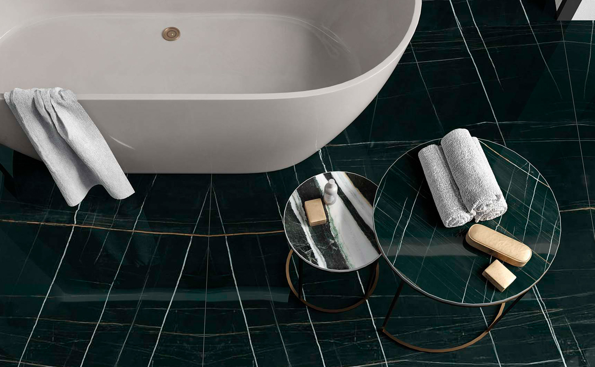 Volendo includere altri colori, si spazia da binomi evergreen come un bagno in marmo nero e bianco (ad esempio con la collezione Sahara Noir) ad accostamenti glamour come l’effetto marmo nero e oro. Qui, piccoli dettagli come le rubinetterie, lo specchio e i portasapone, così come le plafoniere e i punti luce, possono impreziosire e illuminare lo sfondo scuro.E infine, non può essere dimenticato il valore dei complementi d’arredo, come i tessili: l’ingrediente segreto per rendere ancora più personale un bagno nero. Le fantasie geometriche stanno bene in un bagno moderno nero, e in versione multicolor creano un mood etnico ed eclettico. La stessa regola vale per gli accessori bagno, come specchi da tavolo, organizer e dosatori per sapone.