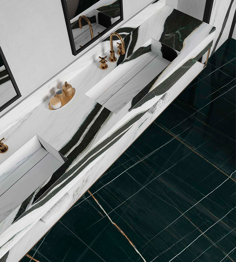 Un altro punto di forza, questa volta dal punto di vista progettuale, è la possibilità di installare rivestimenti in grandi lastre su una superficie piana già esistente. Grazie alla leggerezza e allo spessore sottile delle lastre, aggiungere un secondo livello su pareti e pavimenti è un’opzione da considerare. Un notevole risparmio di tempo e di costi, senza lavori di demolizione, e una scelta di sostenibilità ecologica, visto che non si producono macerie edili.