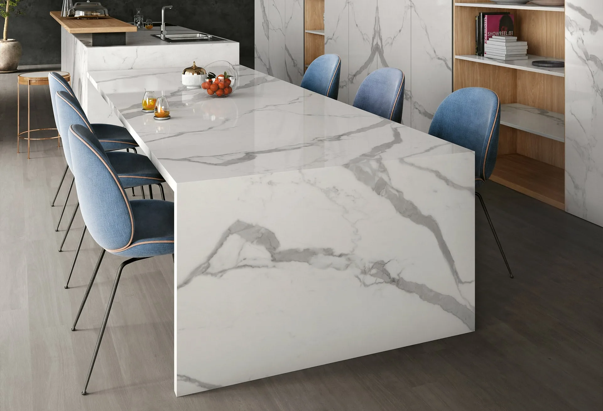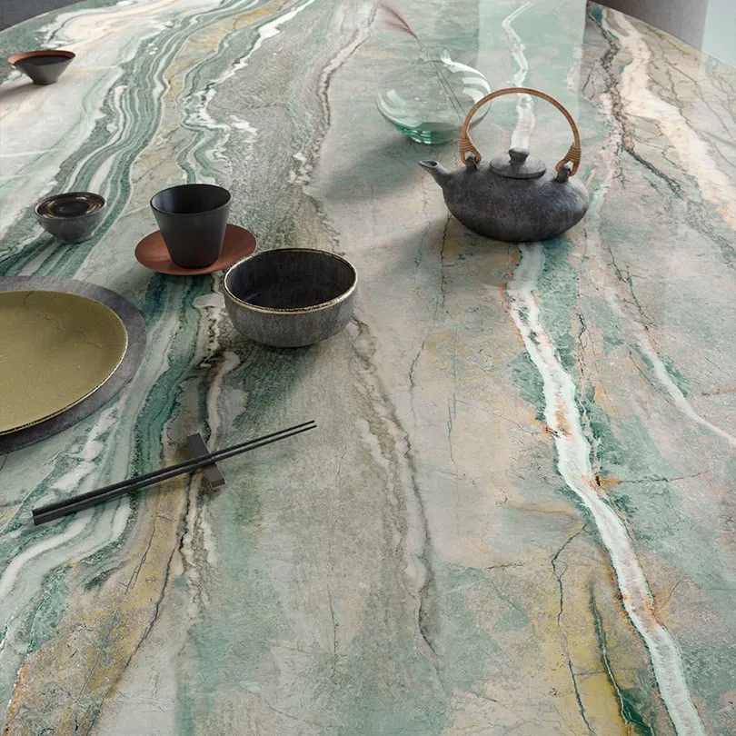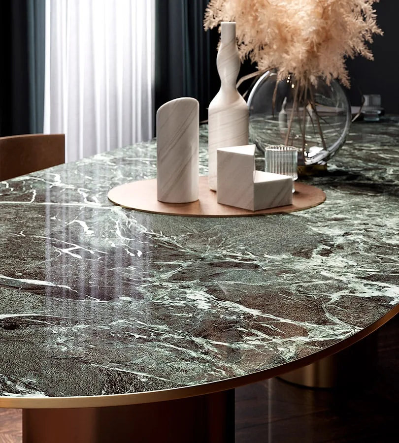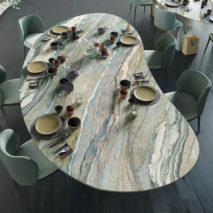Guardando agli spazi domestici e commerciali come a un grande canvas bianco a cui infondere linfa vitale, i tavoli in gres effetto marmo sono la sintesi ideale tra funzionalità e ornamento, matericità e ispirazione artistica.