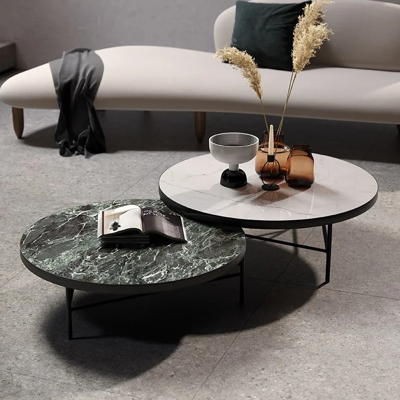 Tavolo rotondo in gres effetto marmo: l’apoteosi della leggerezza