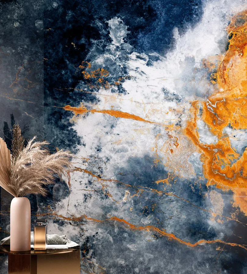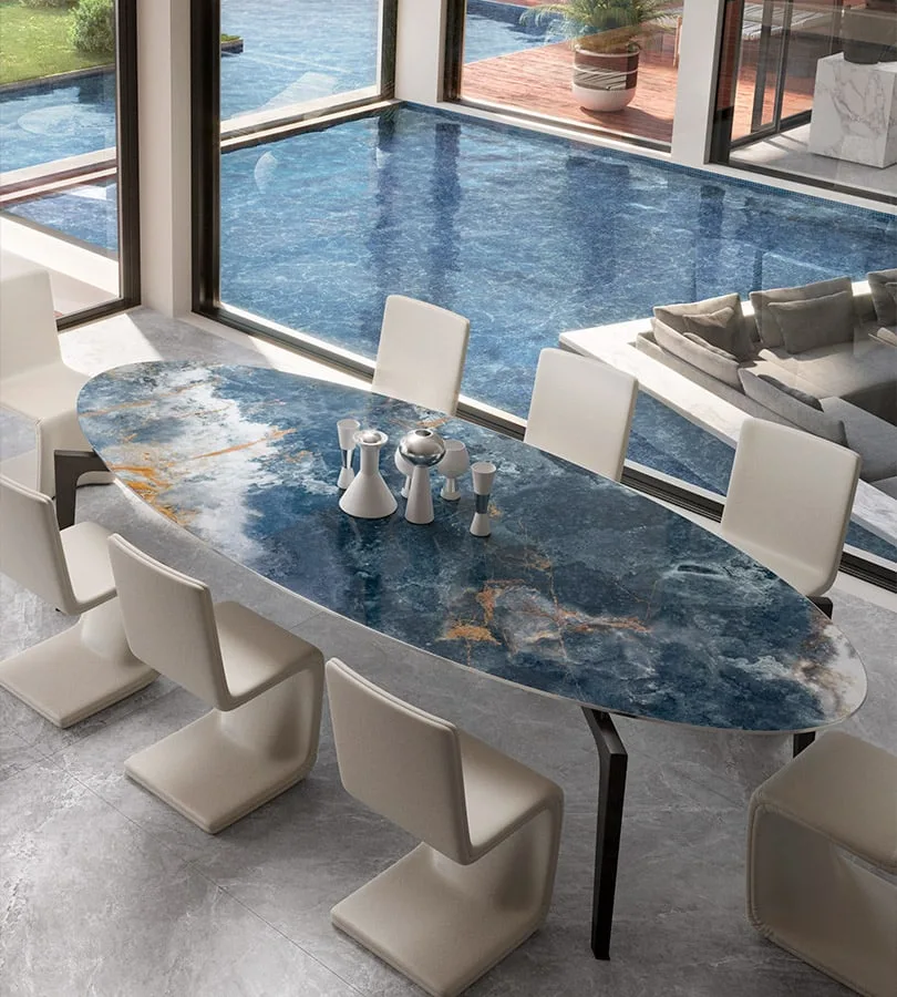 Perfette come rivestimento di tavoli outdoor, coniugano lo splendore dell’effetto marmo con intense striature di blu e fiammeggianti cromatismi dorati.