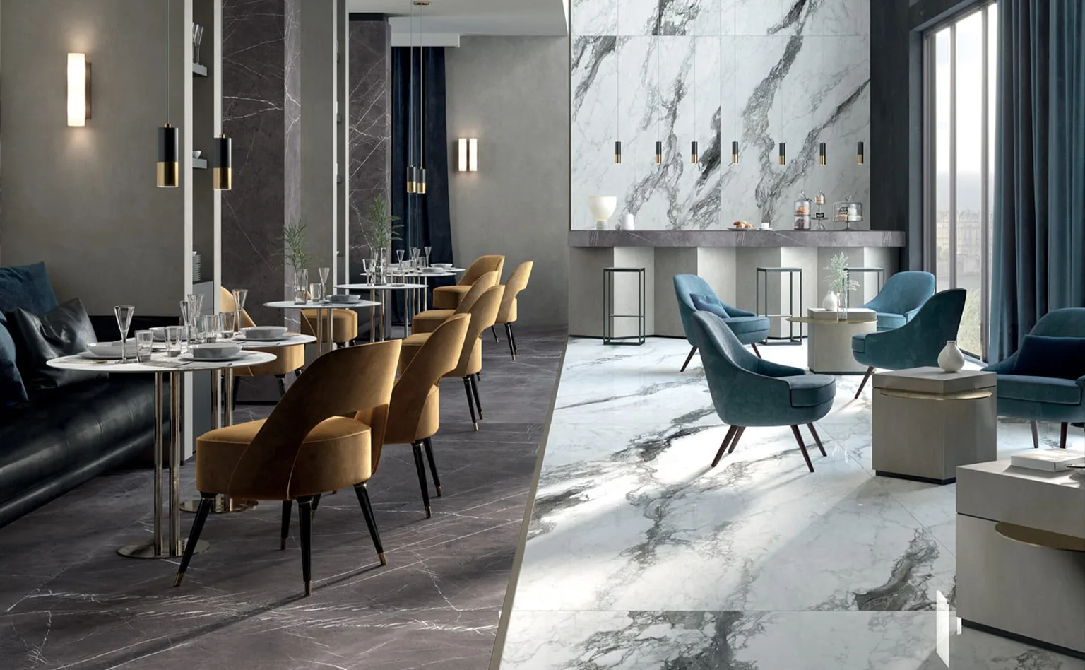 Le grandi lastre offrono continuità visiva, meno fughe, maggiore igiene, durabilità superiore e un’ampia possibilità di personalizzazione. Sono ideali per pavimenti e rivestimenti, anche integrati tra loro.